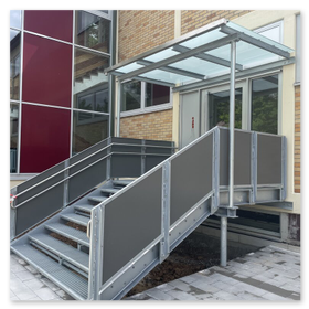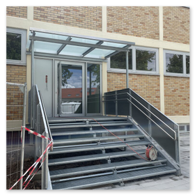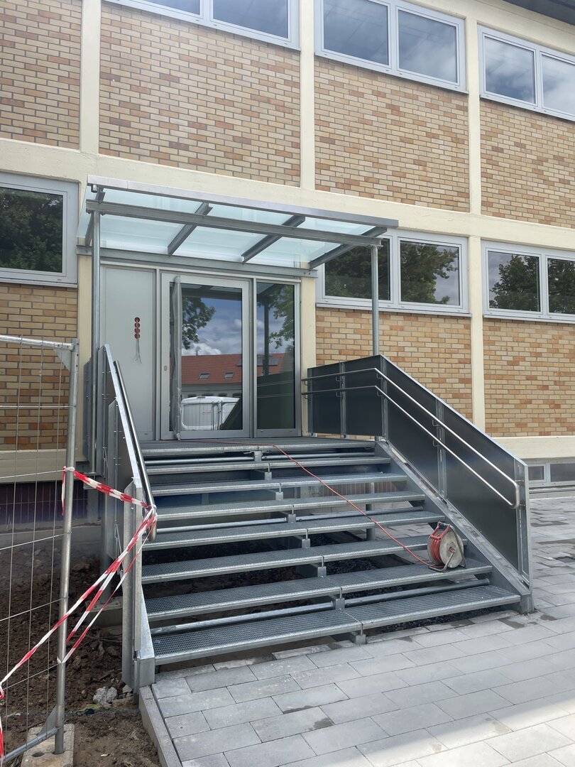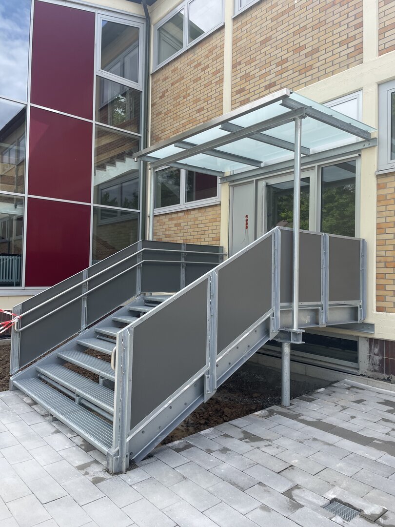 Der Kindergarten der Nachbargemeinde erhielt im Rahmen eines Umbaus eine moderne Treppe mit Überdachung.