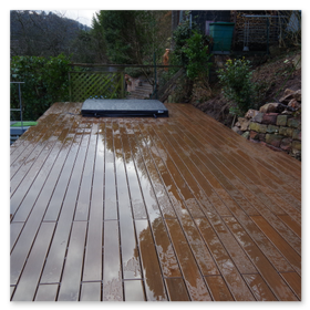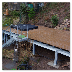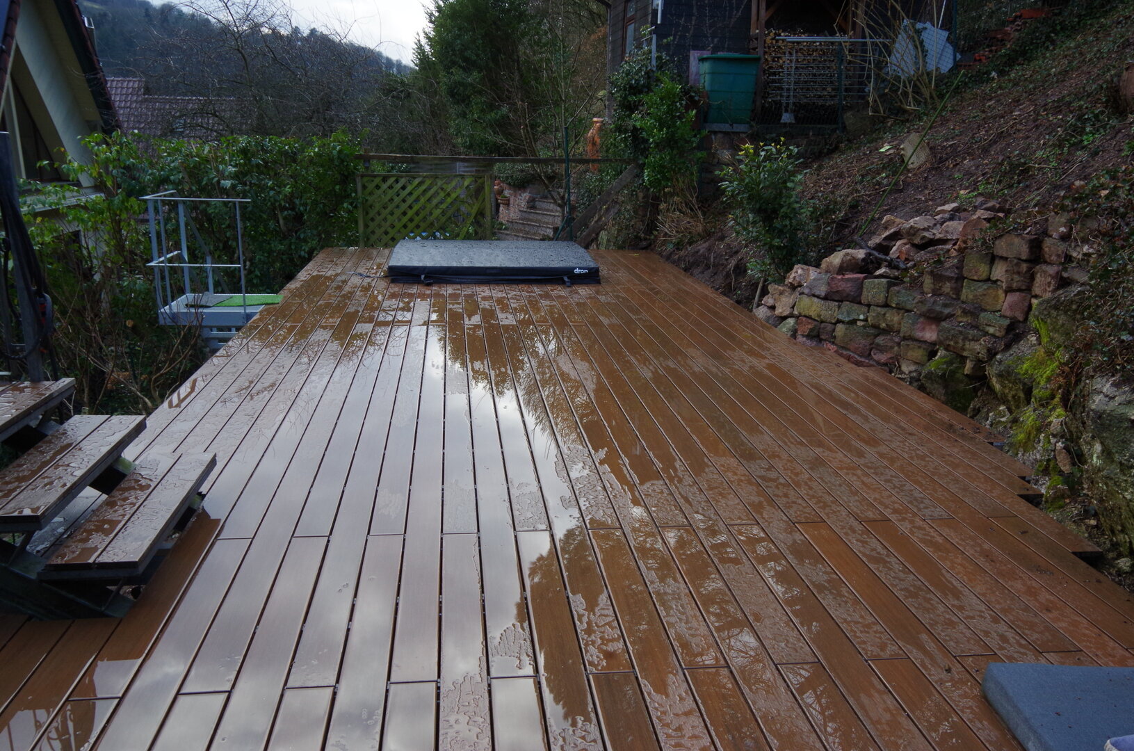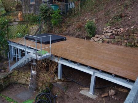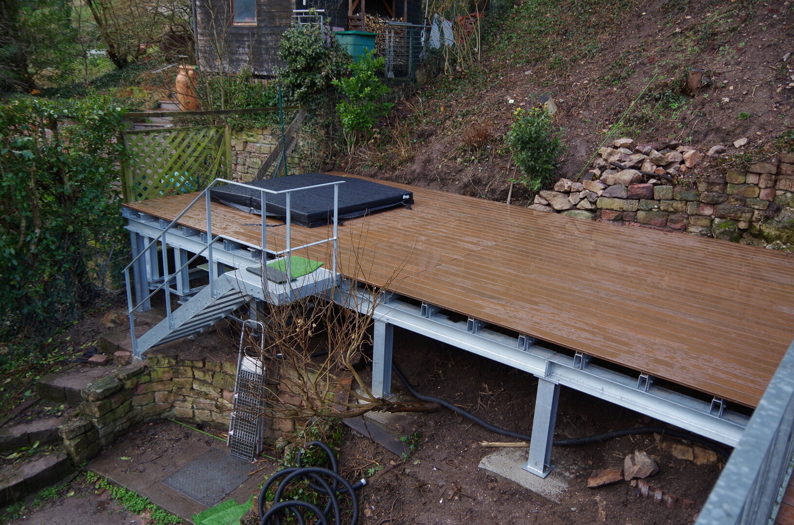 Für die Umsetzung wurde eine stabile Stahlunterkonstruktion errichtet, die nicht nur die erweiterte Fläche trägt, sondern auch für die zusätzliche Belastung eines Whirlpools ausgelegt ist. Als Bodenbelag entschied sich der Kunde für hochwertiges WPC, das nicht nur langlebig, sondern auch pflegeleicht ist. Zudem wurde der Belag des Stegs vom Haus zur Terrasse ebenfalls mit WPC erneuert, sodass ein harmonisches Gesamtbild entstand.