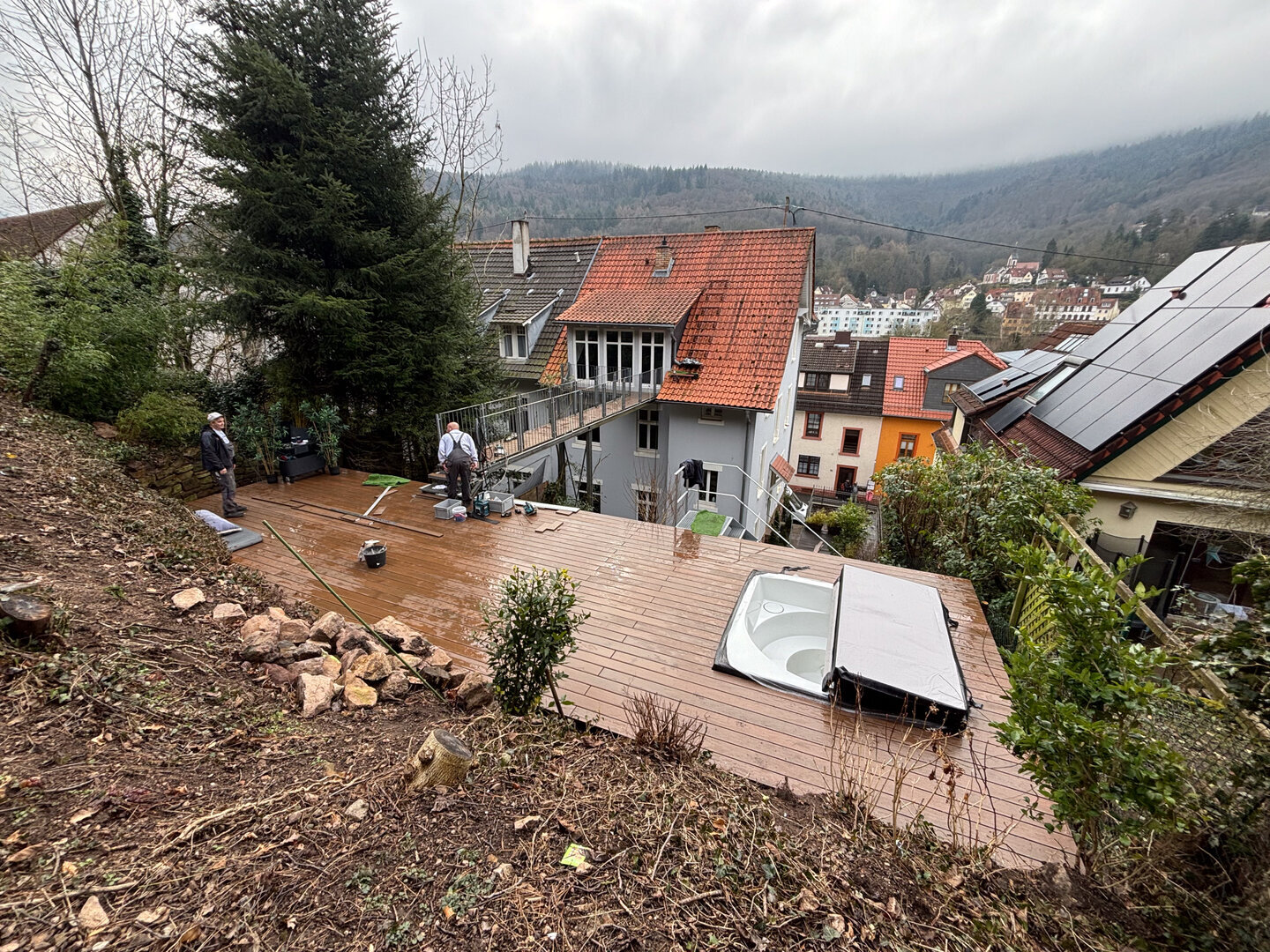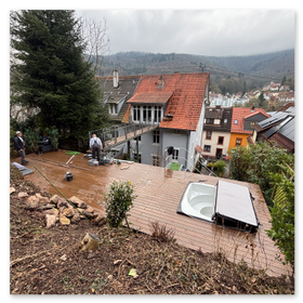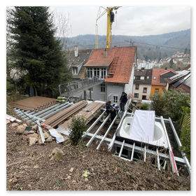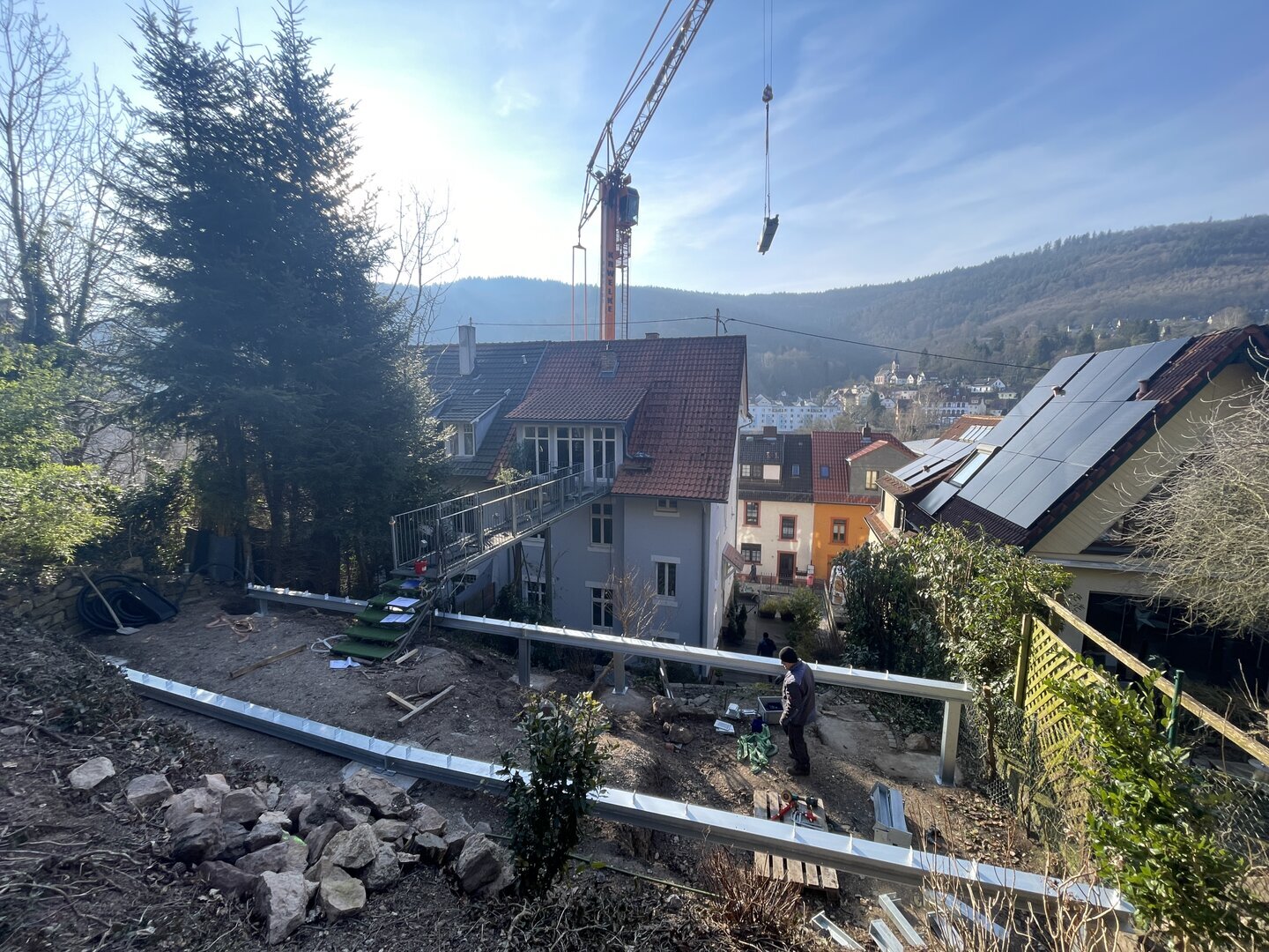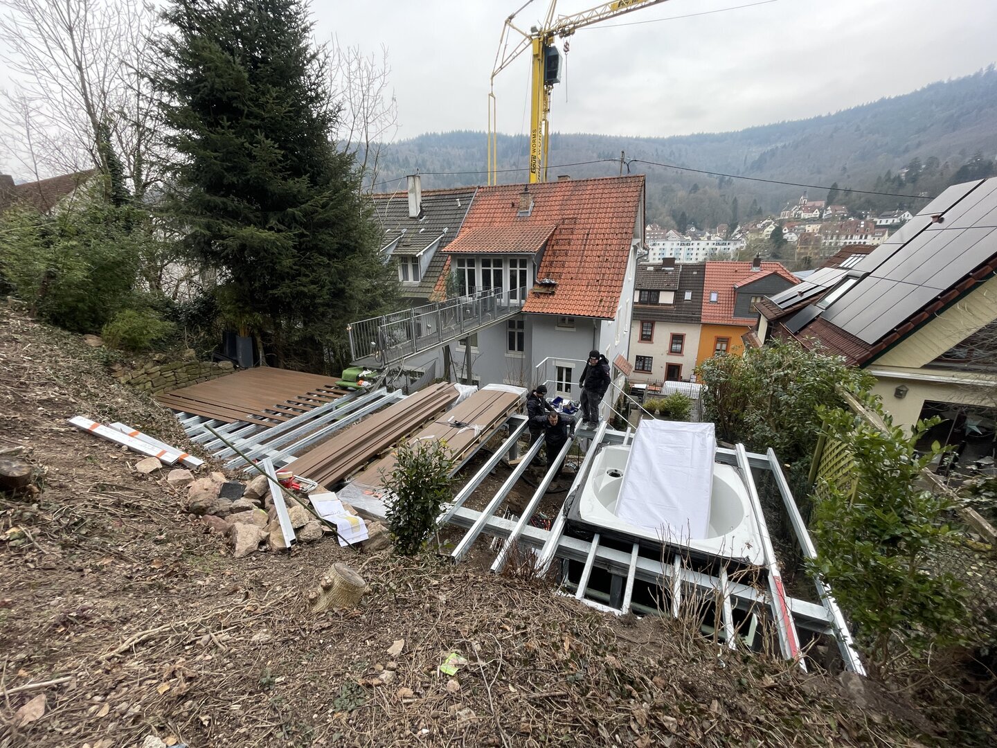 Kunde S. aus Ziegelhausen hatte den Wunsch, seine Terrasse nicht nur zu erneuern, sondern auch zu vergrößern. Die Herausforderung dabei: Die Terrasse lag an einer Hanglage, sodass das benötigte Material nur mit einem Kran transportiert werden konnte.